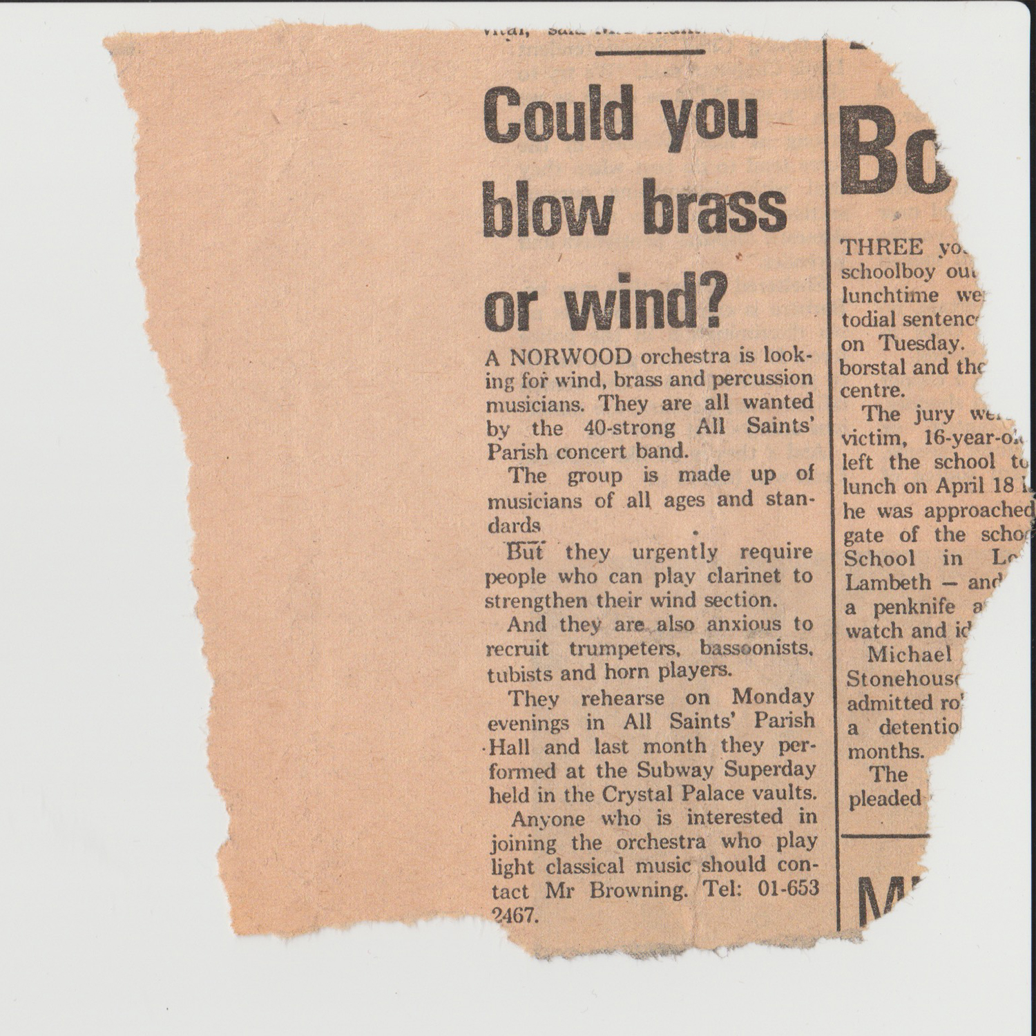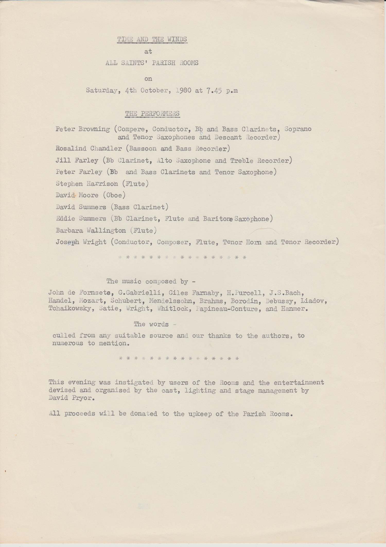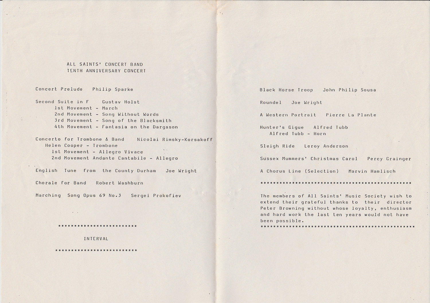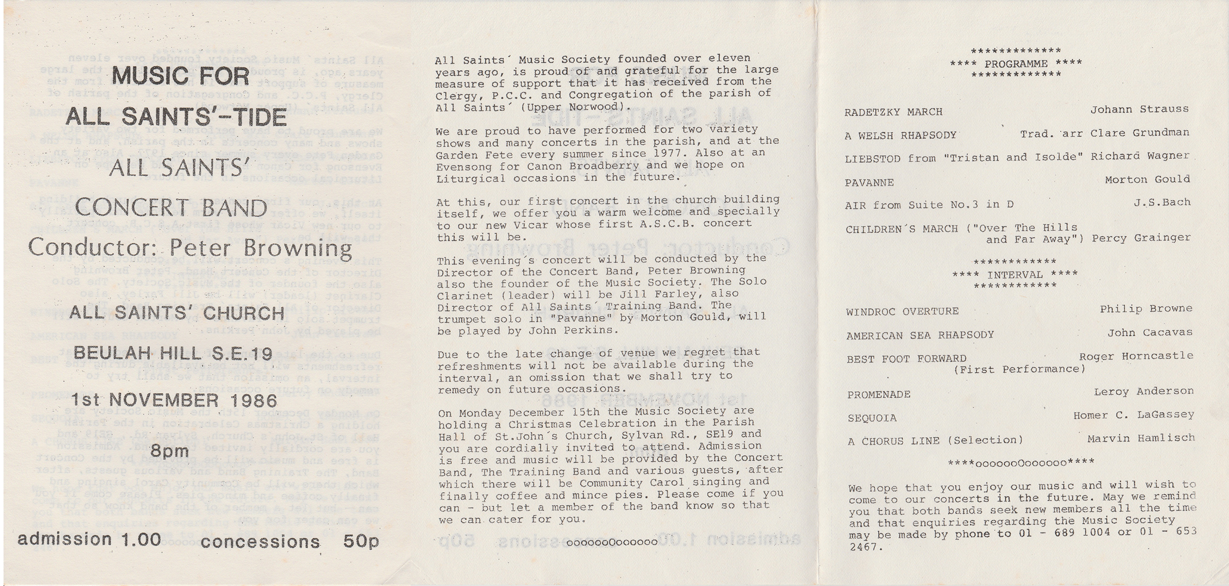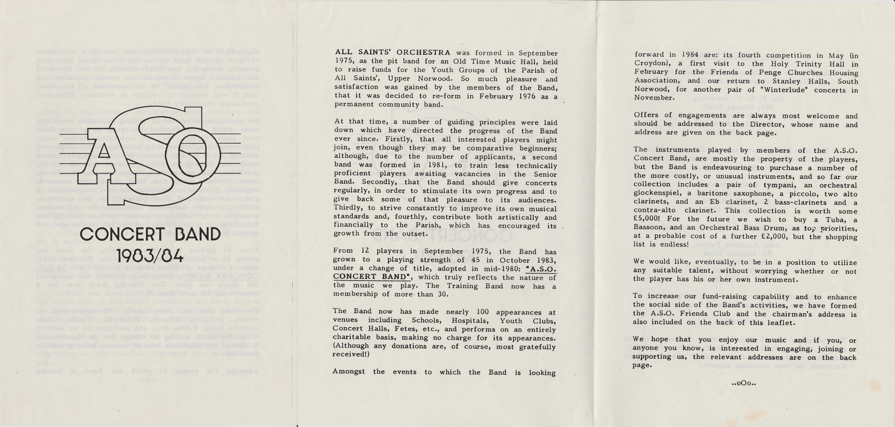All Saints Concert Band was founded in 1975, and amazingly we still have some of those founding and early members with the band! Here is a collection of articles, letters, programmes, and other ephemera that we’ve collected over the many wonderful years.