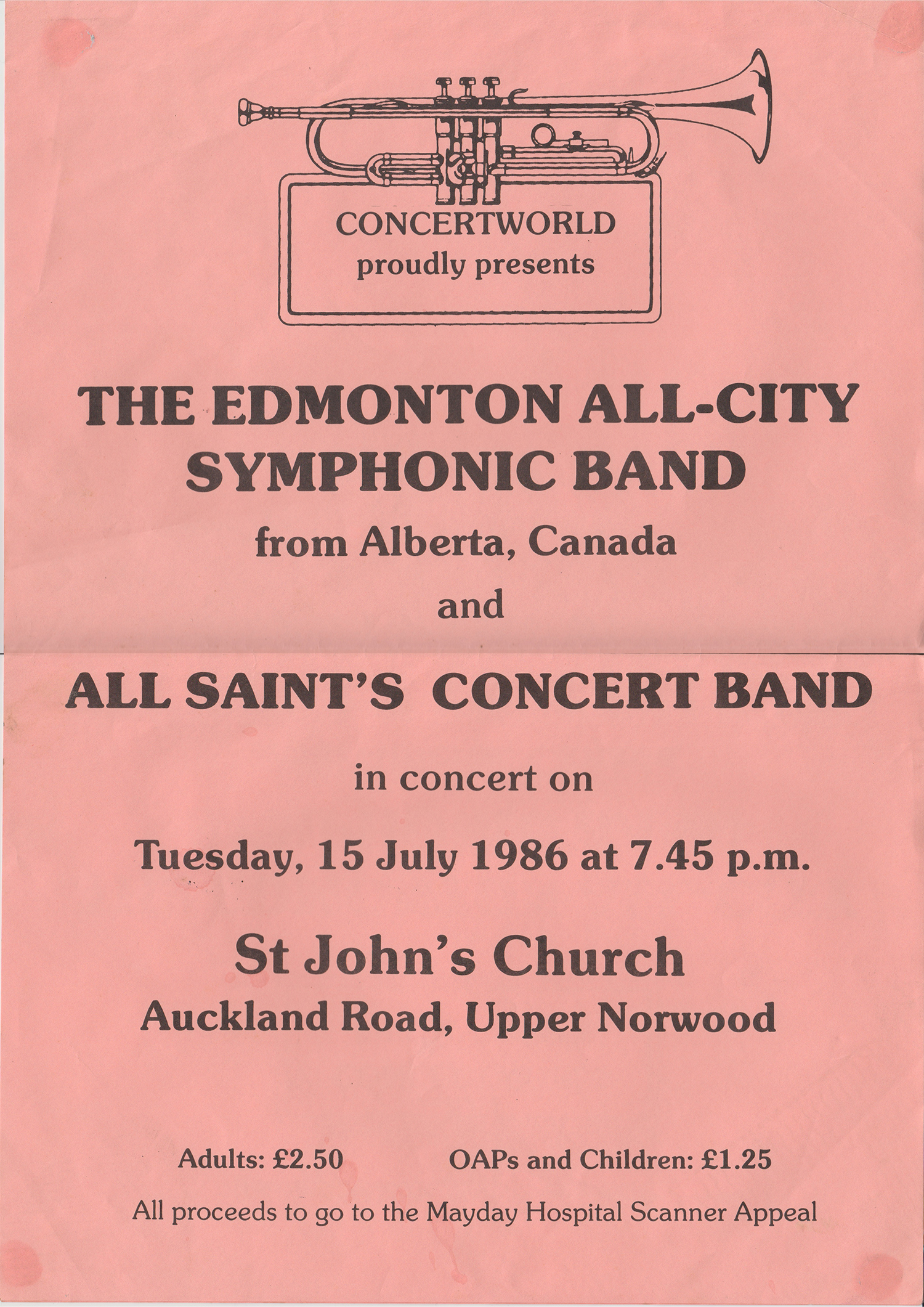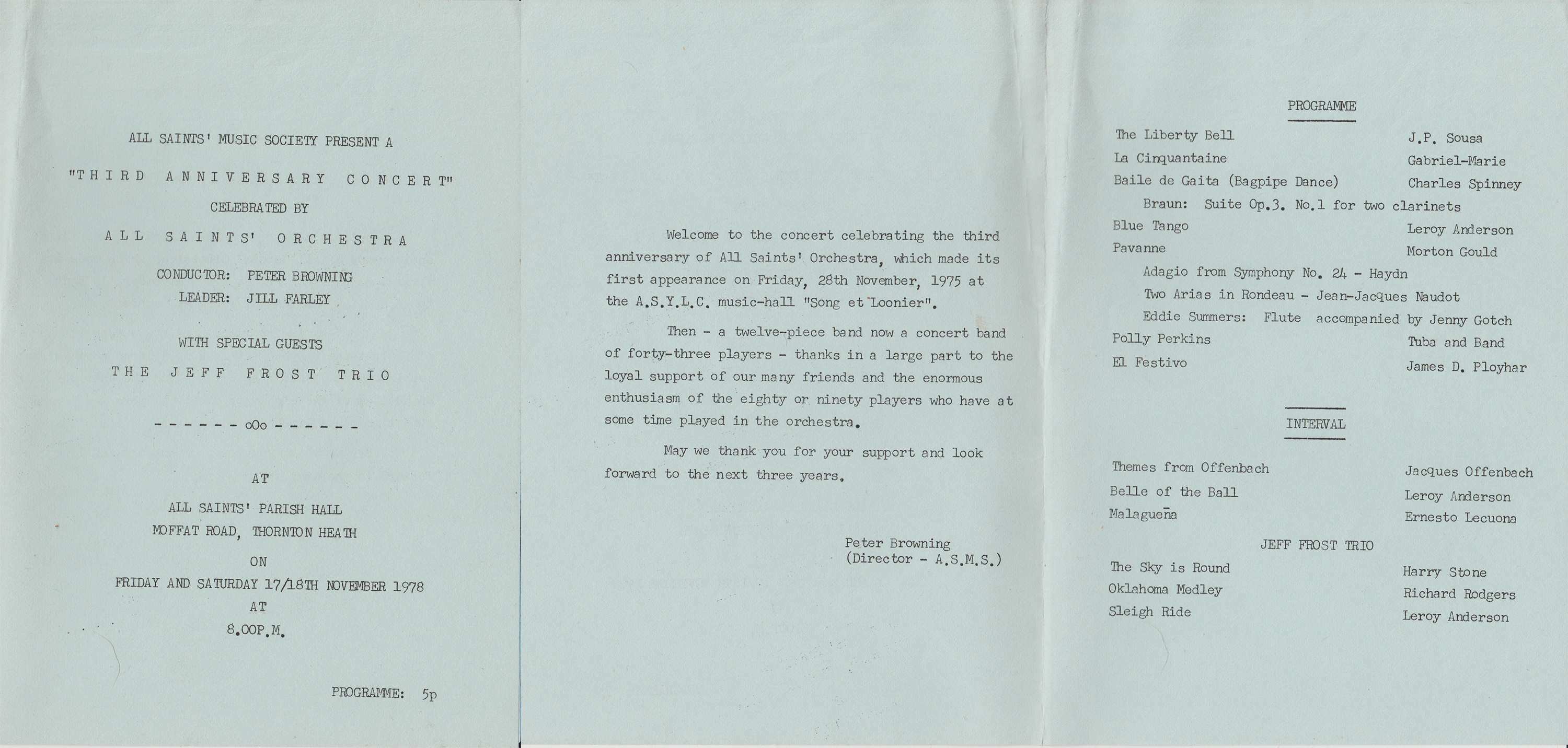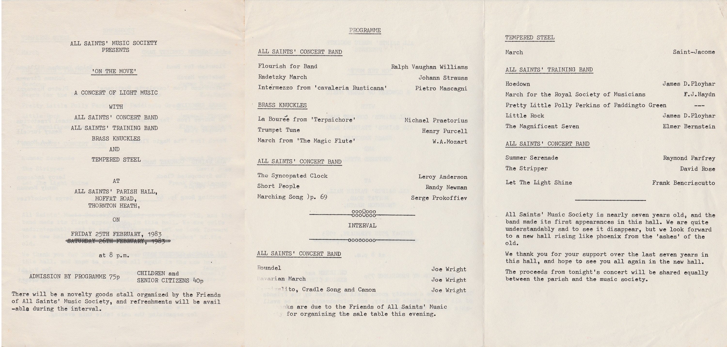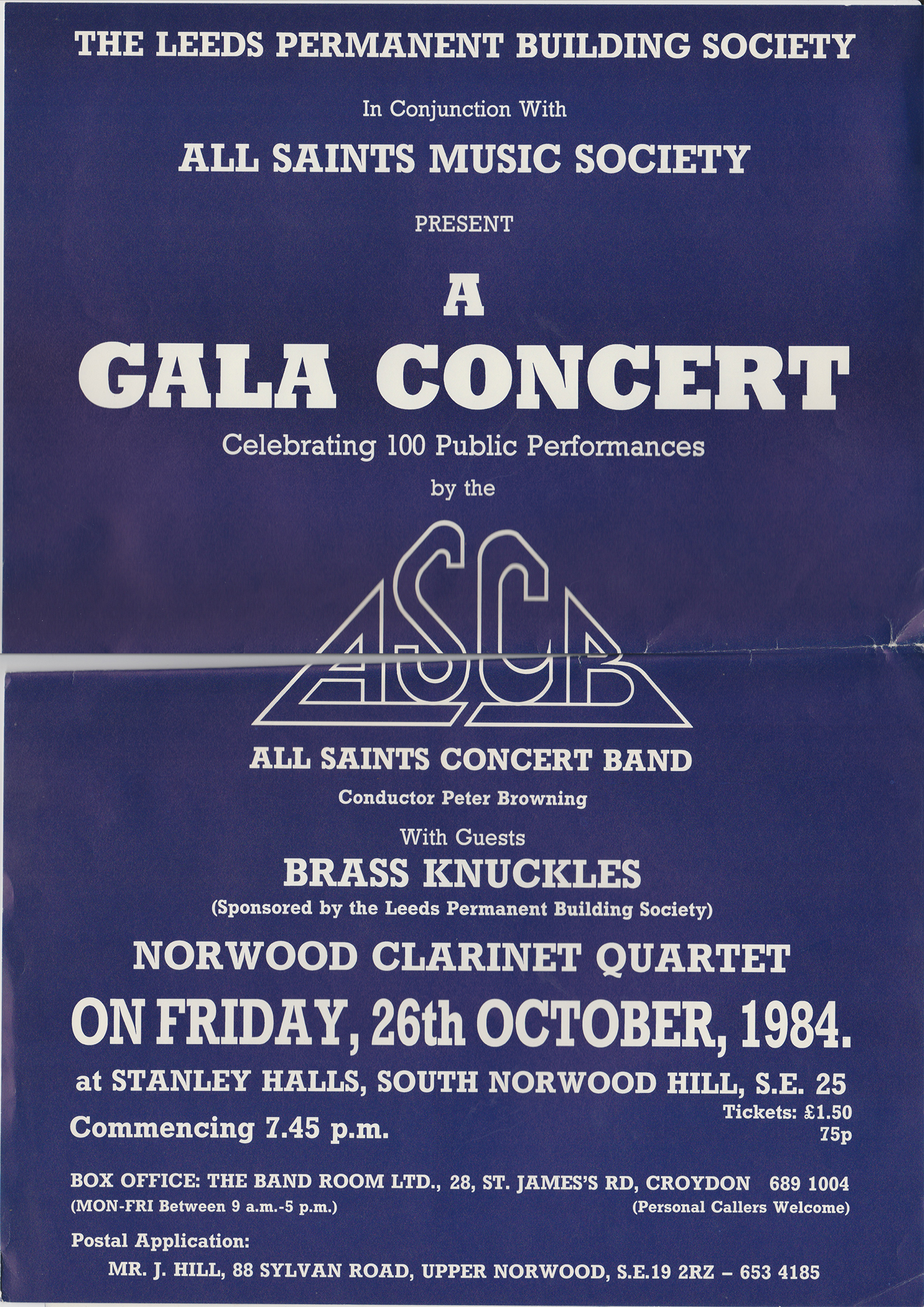 All Saints Concert Band was founded in 1975, and amazingly we still have some of those founding and early members with the band! Here is a collection of articles, letters, programmes, and other ephemera that we’ve collected over the many wonderful years.