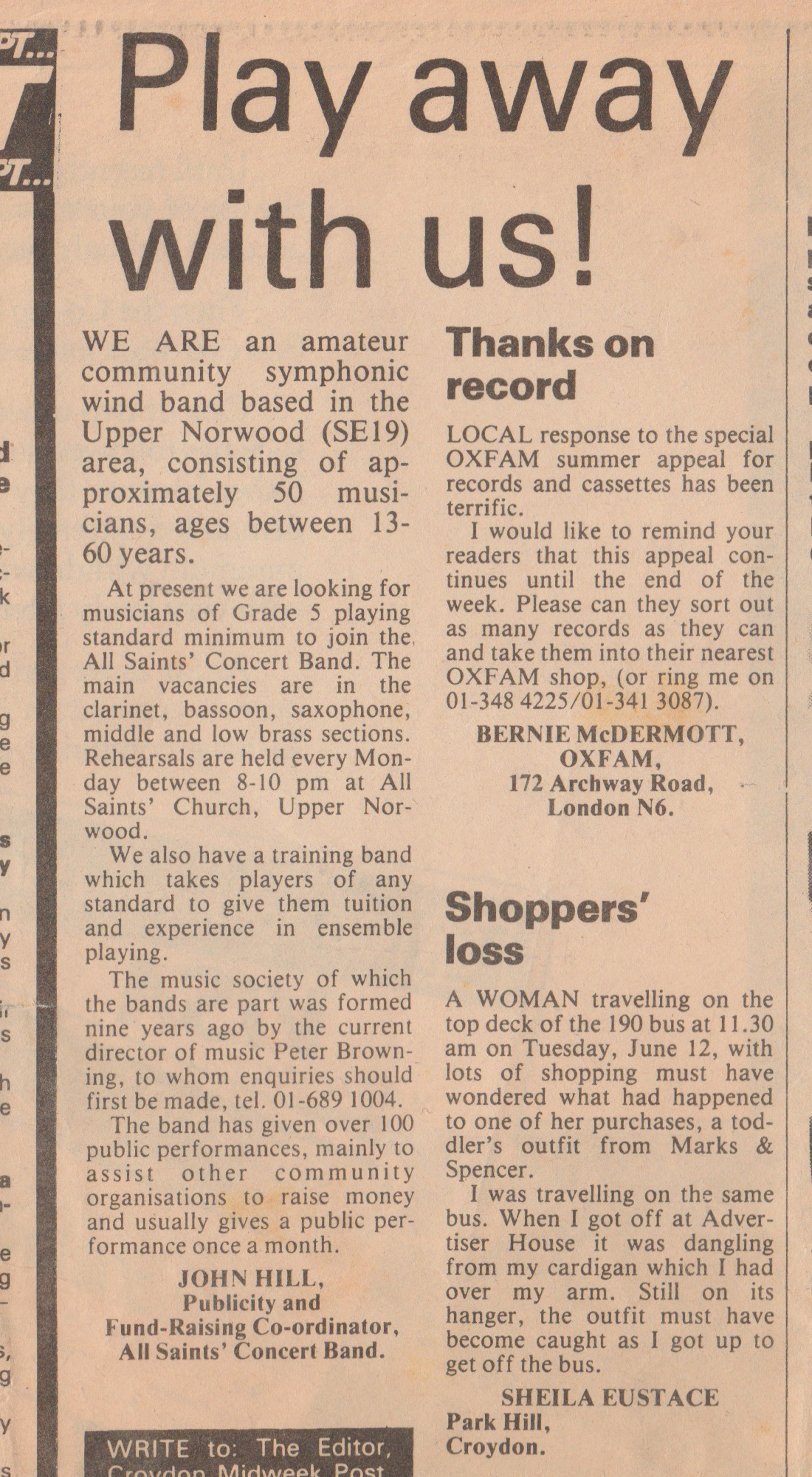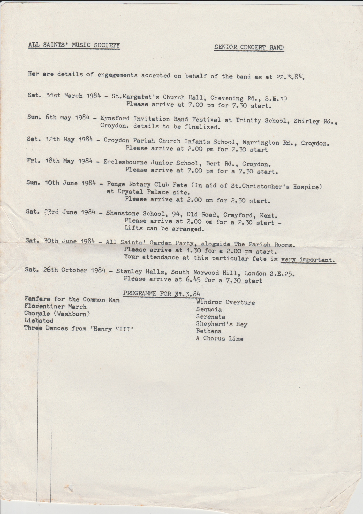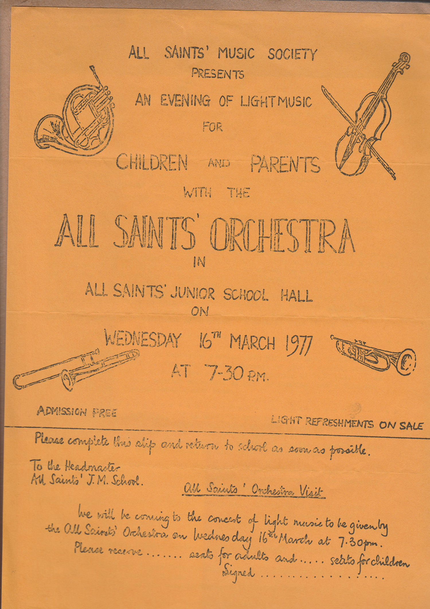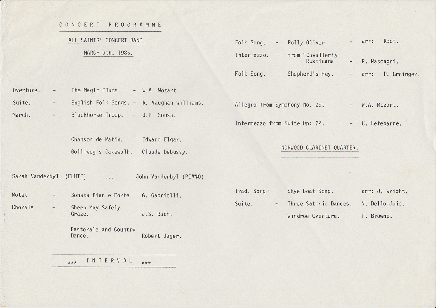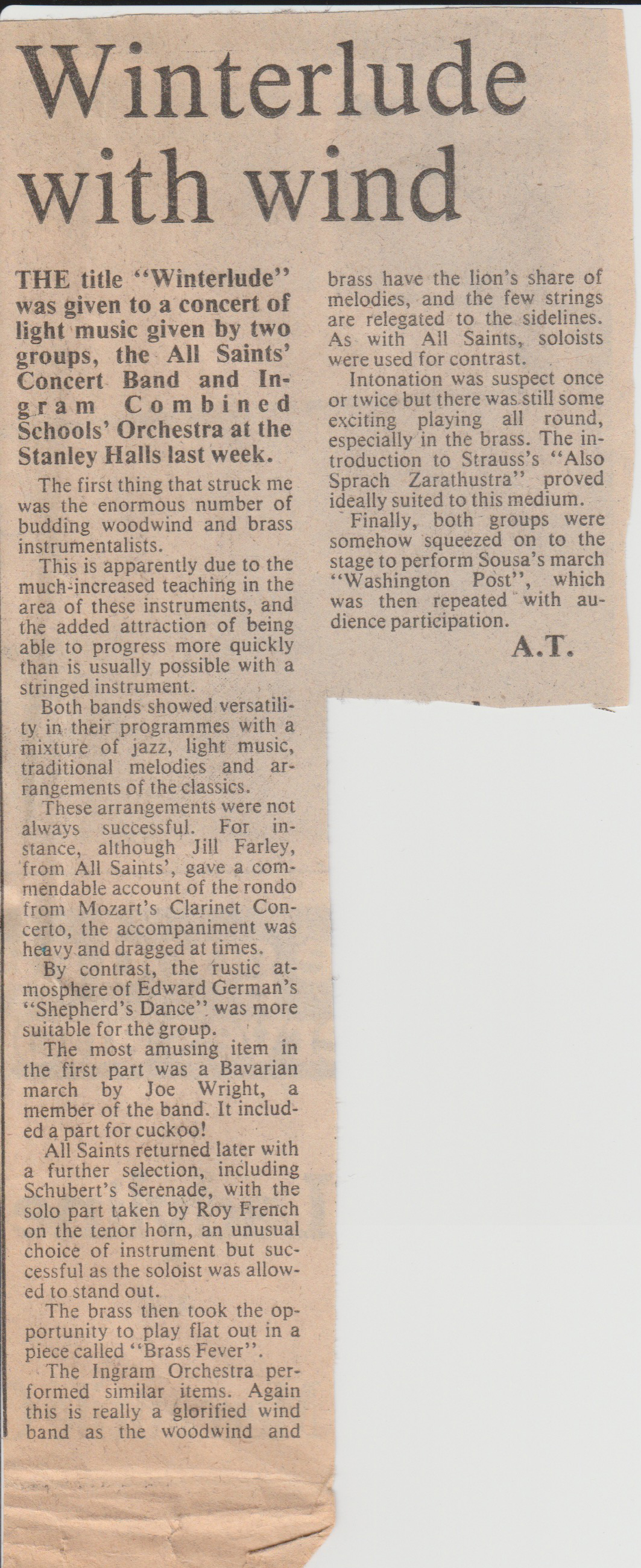 All Saints Concert Band was founded in 1975, and amazingly we still have some of those founding and early members with the band! Here is a collection of articles, letters, programmes, and other ephemera that we’ve collected over the many wonderful years.