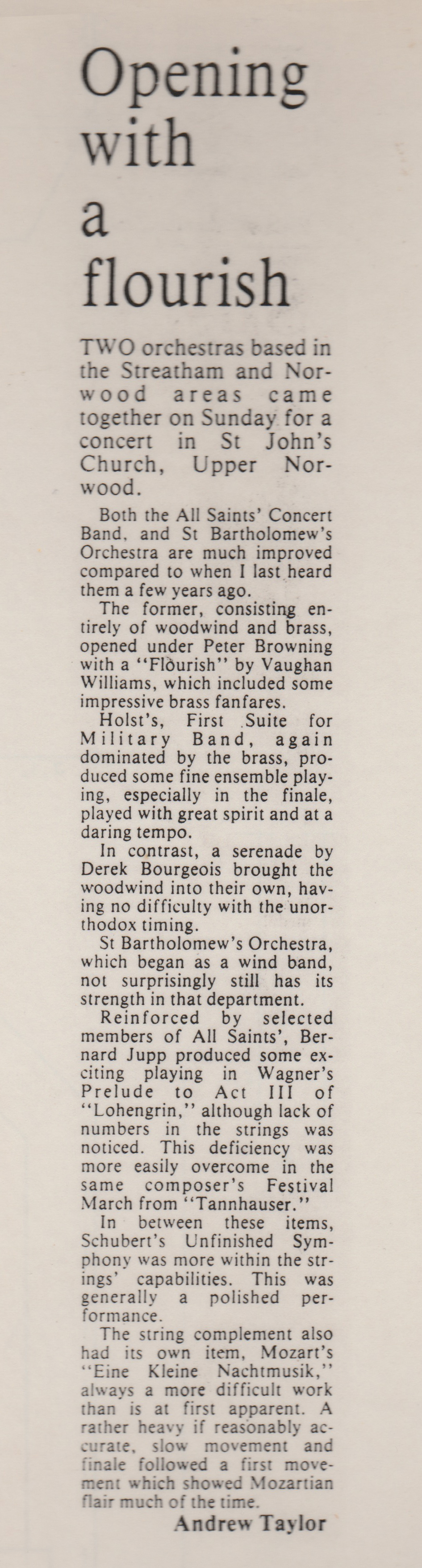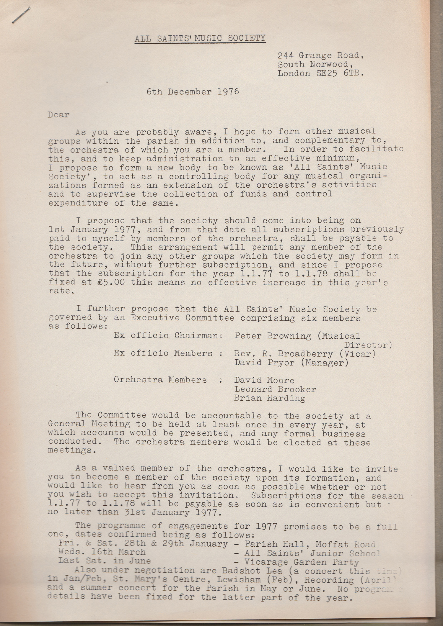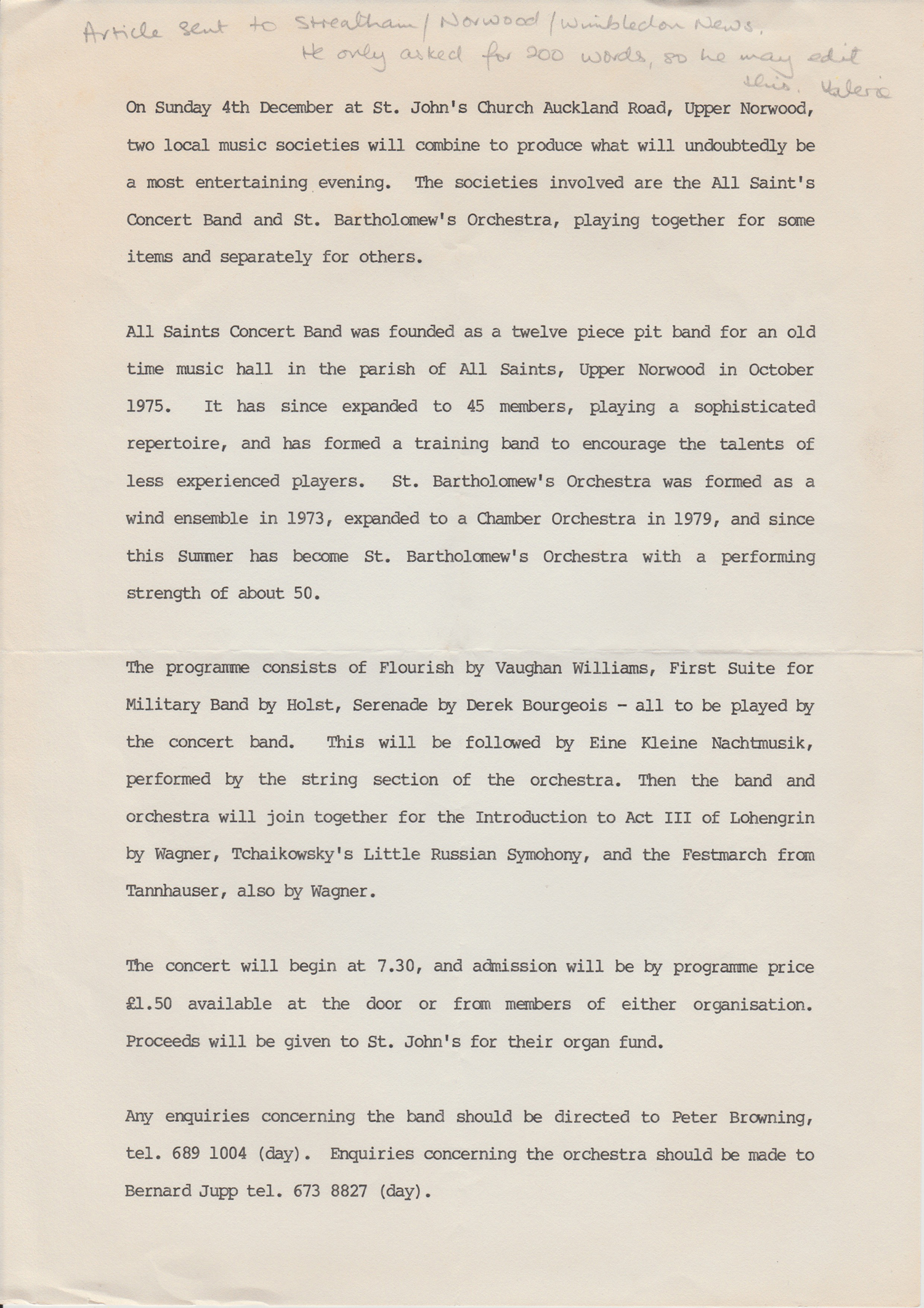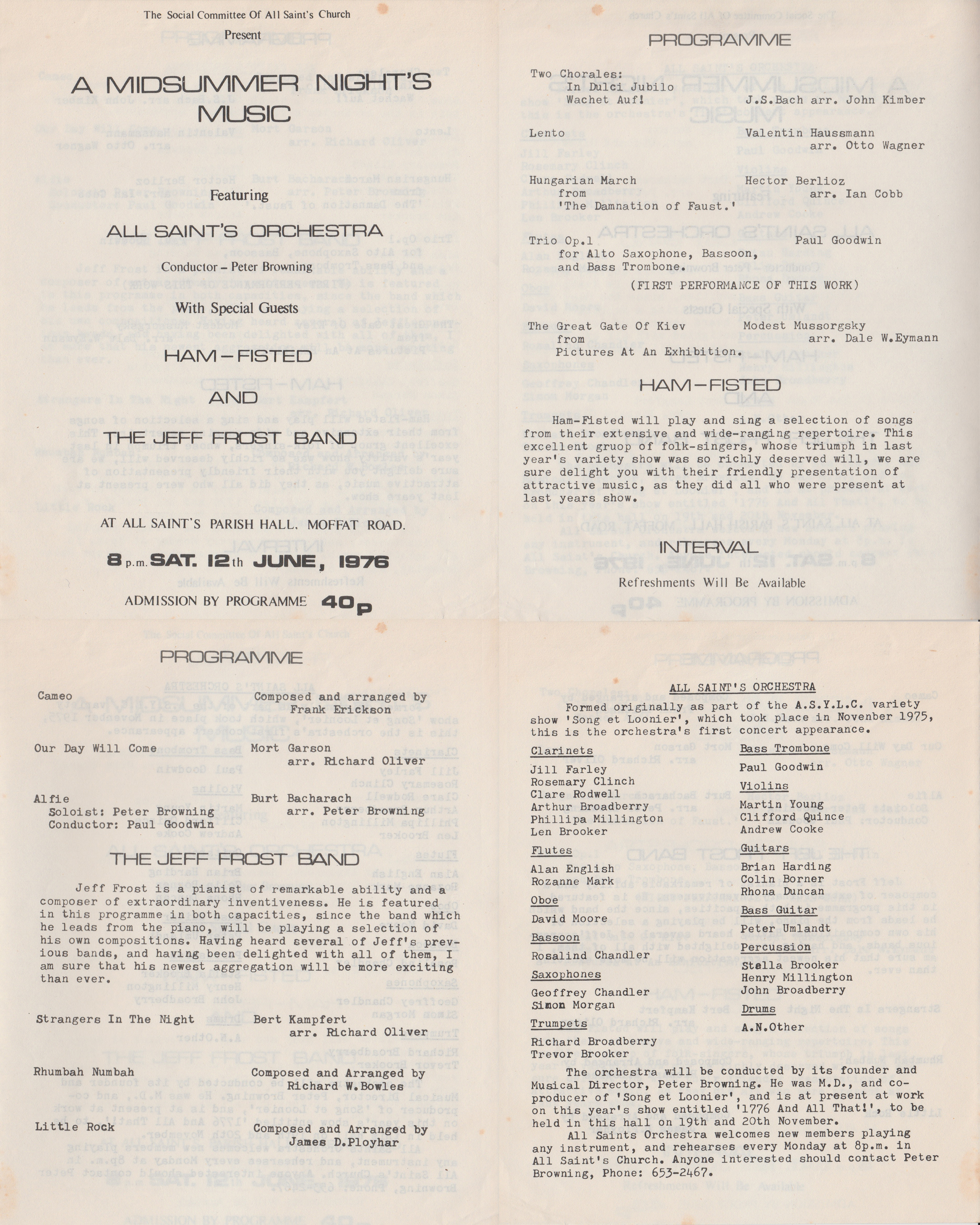 All Saints Concert Band was founded in 1975, and amazingly we still have some of those founding and early members with the band! Here is a collection of articles, letters, programmes, and other ephemera that we’ve collected over the many wonderful years.